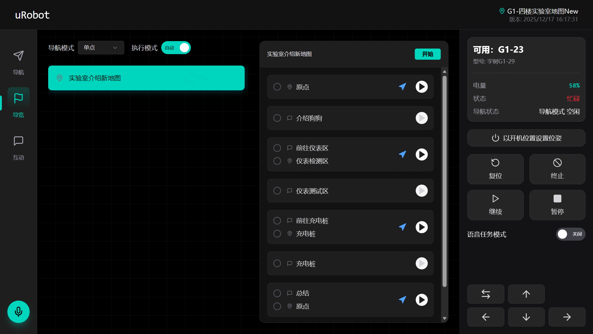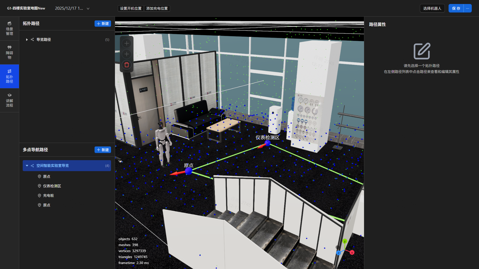 平臺提供可視化地圖構建工具,支持通過圖形化界面快速創建、編輯靜態障礙物與路徑點,實現導覽路徑的動態維護與優化,確保導航環境持續匹配實際場景。