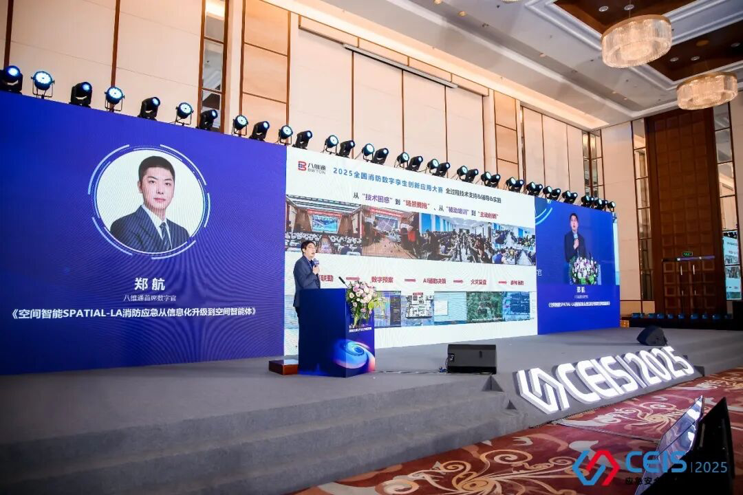 在大會的特邀報告環節,八維通首席數字官鄭航圍繞《空間智能Spatial-LA消防應急從信息化升級到空間智能體》展開分享。他強調,消防應急的下一階段升級,關鍵在于構建能夠理解、計算并推演物理空間的“智能體”。為此,八維通打造了“智空間、智計算、智能體、智具身”四位一體的技術體系,并以此為核心,融合現有信息化系統與數字孿生大賽實踐成果,構建從數字底座、仿真推演、智能決策到實體執行的完整閉環,推動消防應急從“靜態模擬”向“動態干預”演進,為安全應急的前瞻性防控提供堅實支撐。